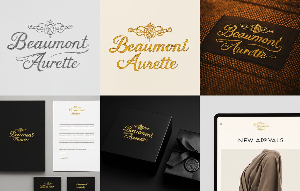 Our voice is refined yet approachable, blending serif and sans-serif fonts with a palette of black, ivory, gold, and blush.